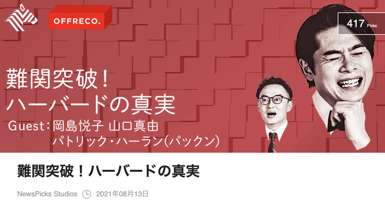 少し前の特集でしたがNewsPicks内でハーバード大学の卒業生による話し合いが行われていて、学内の様子を聞いていくと少しだけ心が躍る自分がいました。