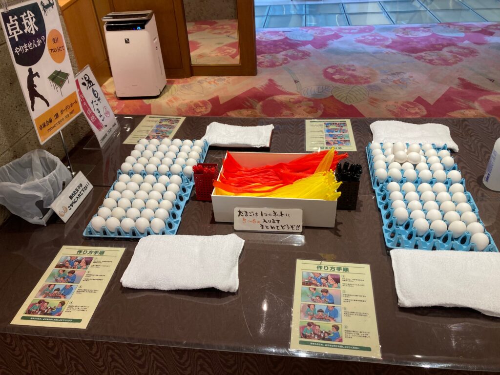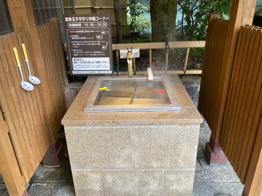 再びお部屋に戻ってみんなで浴衣に着替えました♪このお宿の嬉しいところは子どもの着物のサイズ展開が多いところです。3歳の長男も1歳の次男も着られるサイズがあり、二人に着せて写真大会♪ロビーで温泉たまごを作れるところがあるのでみんなの分を作って温泉へ。