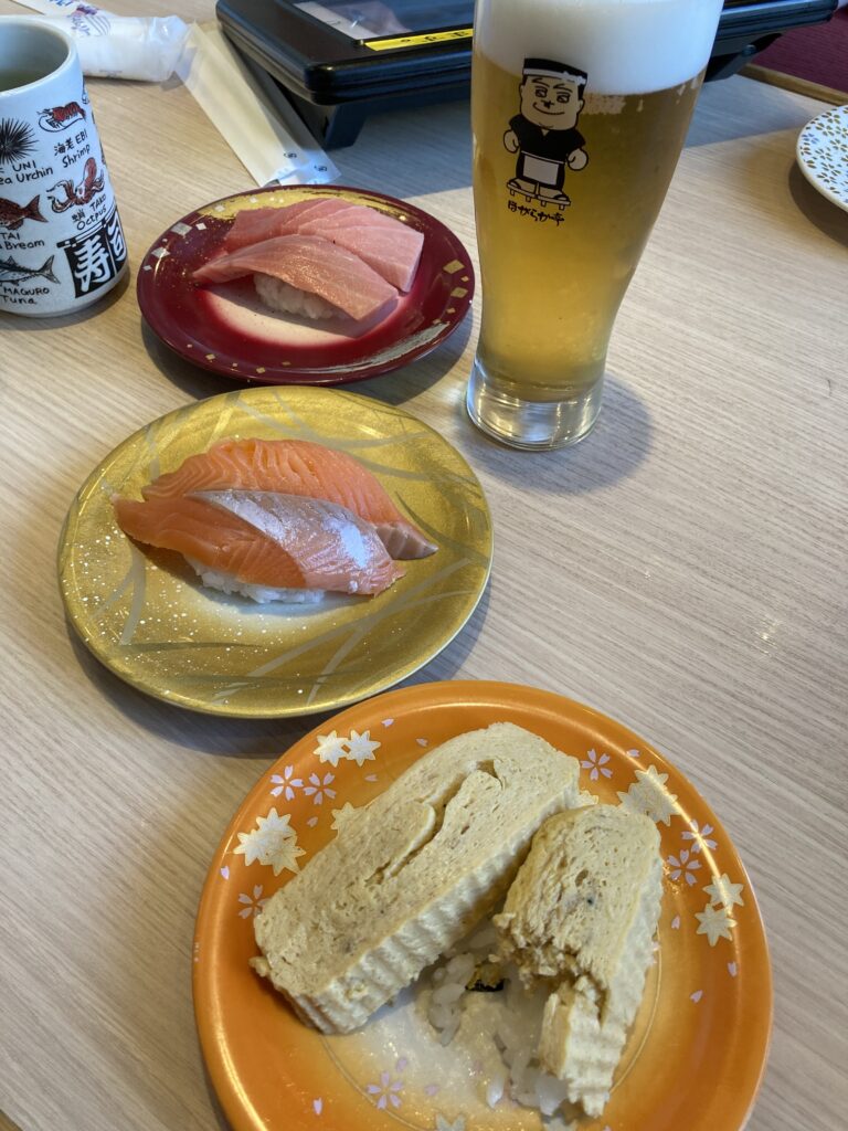 2時間弱楽しんでから、ランチは福井県福井市にあるくるくる寿司ほがらか亭。日本海さかな街から50分程だったので次男は車内でお昼寝。到着すると平日ですが待ち時間10分程でした。テーブル席が5席でほかはカウンターです。テーブルに案内して頂くと子ども用の椅子をお借りすることができました。テーブルに付けるタイプの椅子で次男は立ち上がることができずきちんと座っていたので本当に助かりました♪